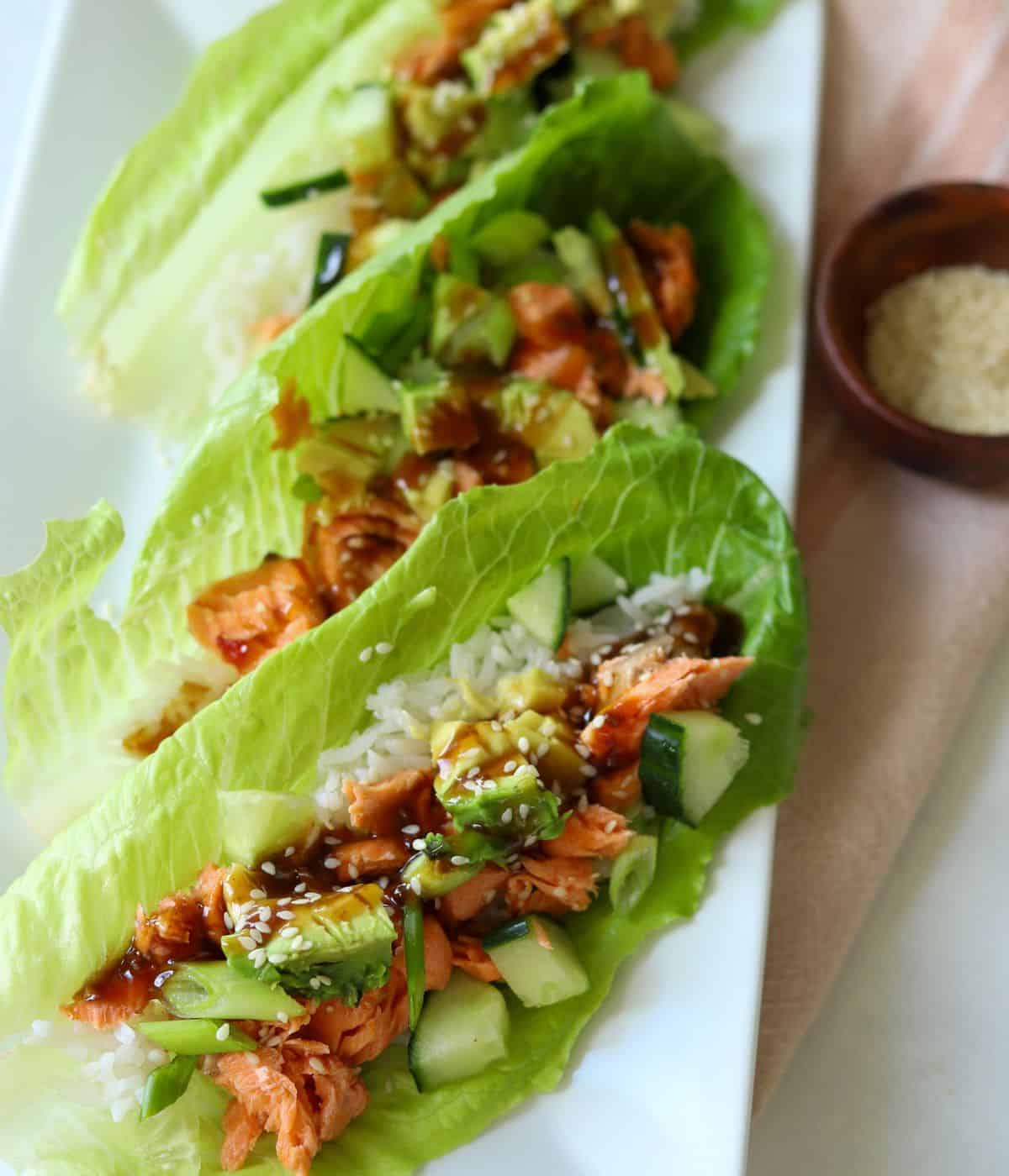 - To assemble the lettuce wraps, hold a piece of lettuce in the palm of your hand, so it's like a little bowl. Add a few tablespoons of rice, then salmon. Next, add on the toppings of avocado, green onion, cucumber and top with teriyaki sauce and sesame seeds. Enjoy!ย Note: I like to serve everything in bowls like taco night so each person can make their own.