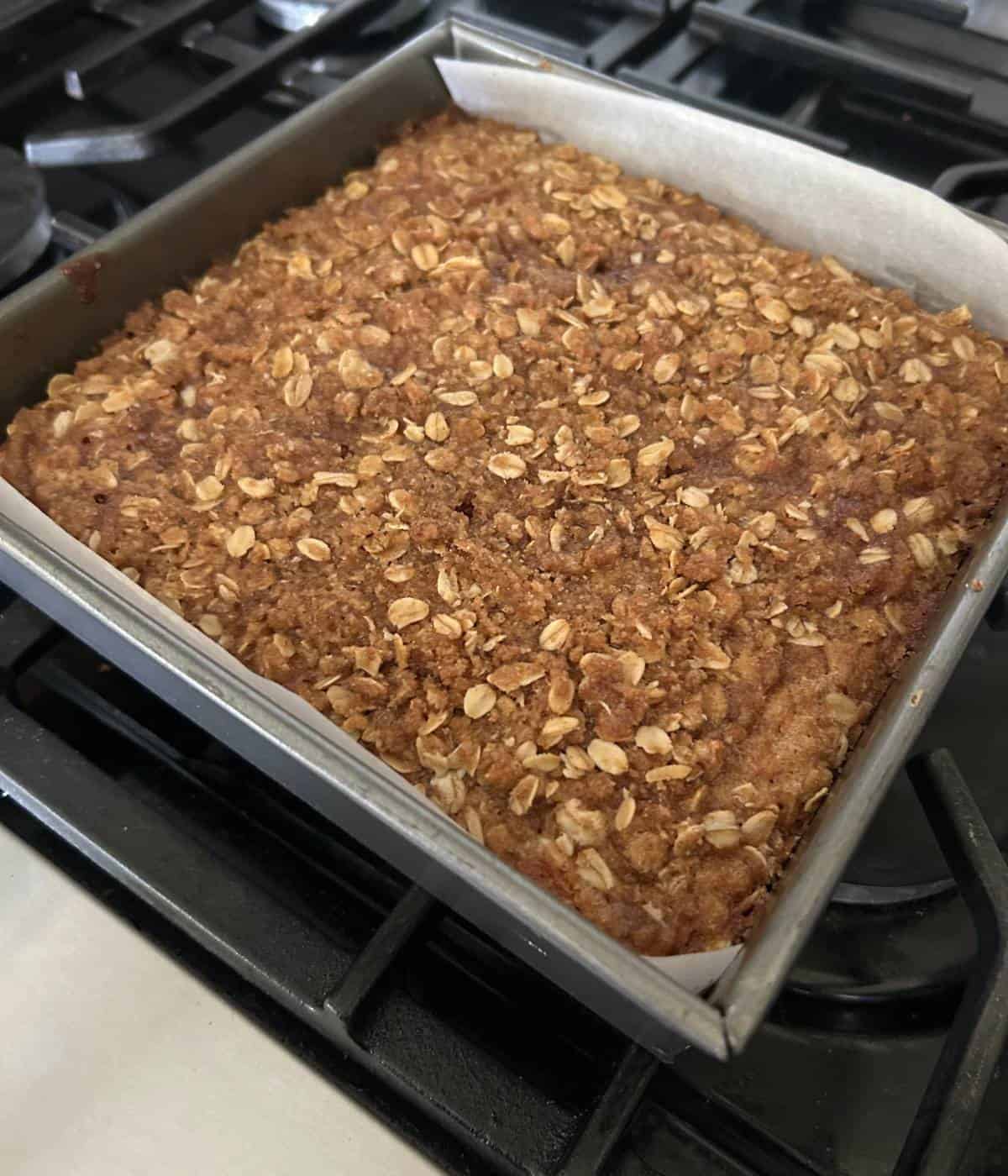 - Sprinkle the oatmeal topping over the entire top of the cake batter.