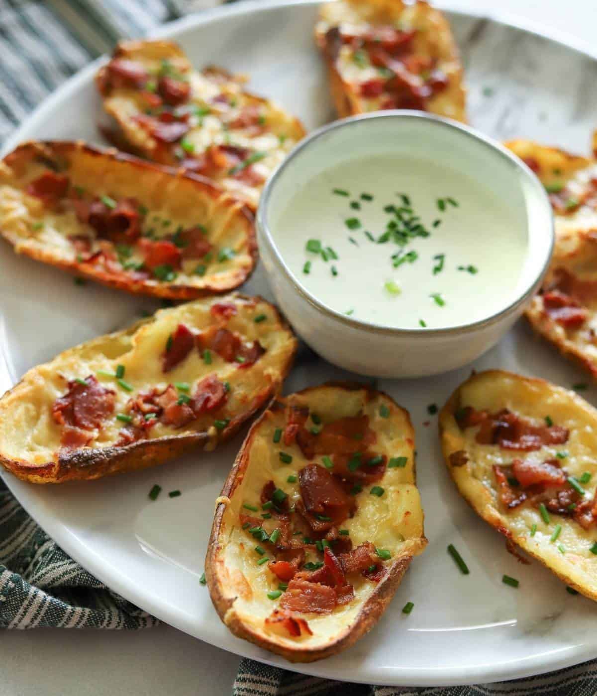- Top the potato skins with remaining 1 tablespoon of chives. Grab the ranch from the fridge and give it a quick stir before serving next to the potato skins. Enjoy!